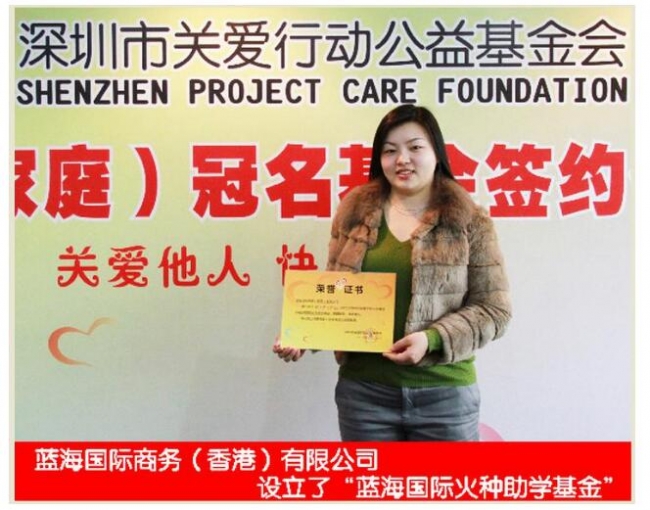 2014年01月10日,劉光容女士用她的其中一個公司【藍(lán)海國際商務(wù)(香港)有限公司】名義,在深圳市關(guān)愛行動公益基金會成立了設(shè)立了“藍(lán)海國際火種助學(xué)基金”。